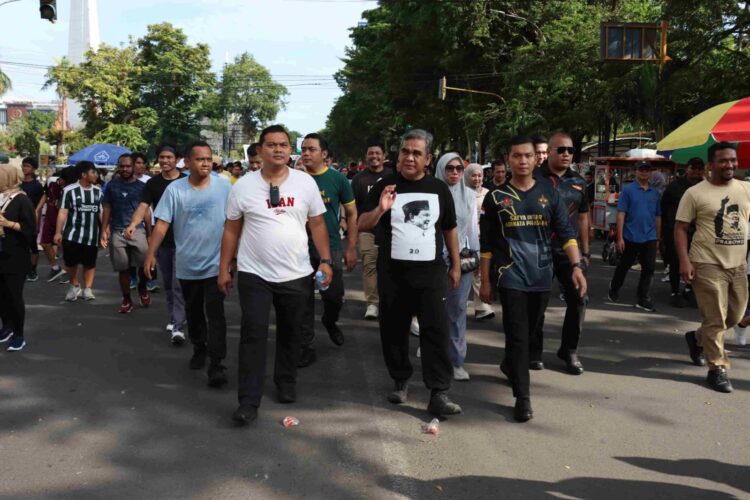 Sekjen Partai Gerindra Ahmad Muzani bersama Calon wakil presiden nomor urut 2, Gibran Rakabuming Raka menghadiri acara jalan sehat bersama puluhan ribu masyarakat Sulawesi Selatan di Jalan Jendral Sudirman, Kota Makassar, Sabtu (25/11).