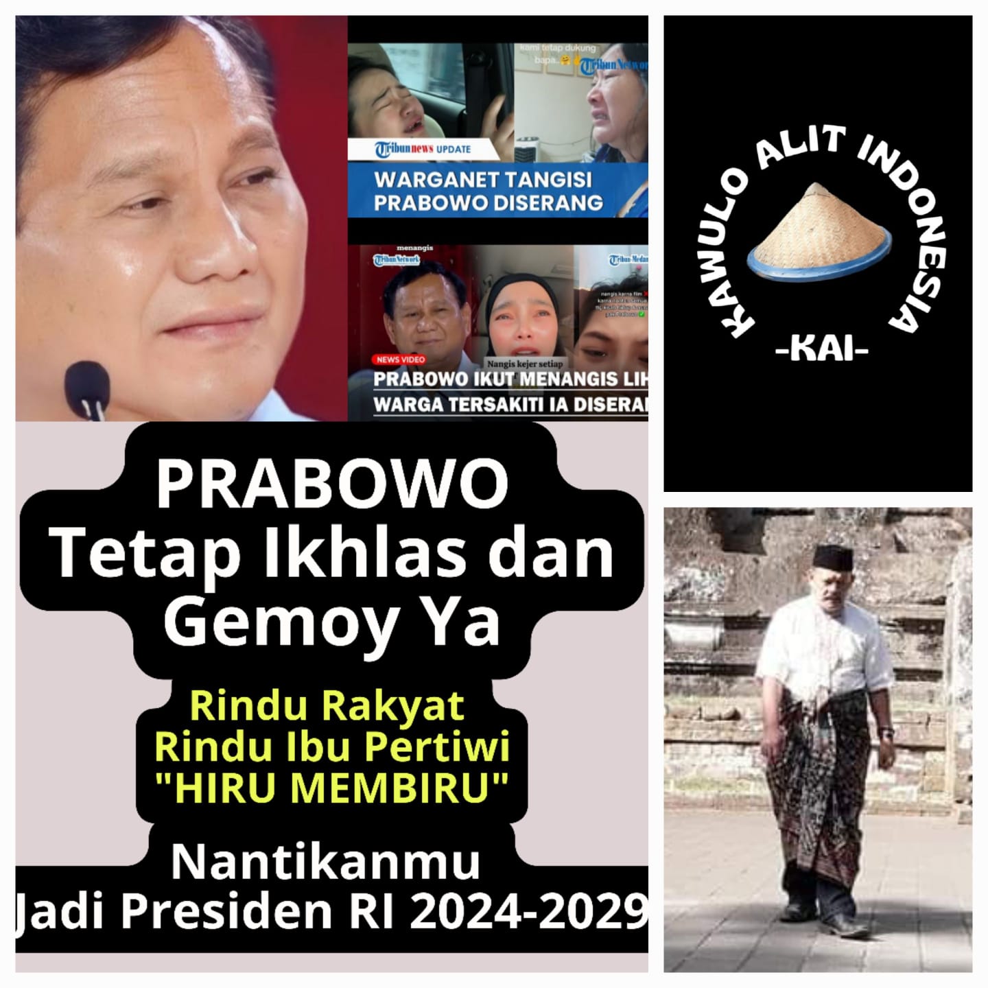 Walau dikroyok, dikuyo-kuyo Prabowo ikhlas demi kesatuan dan persatuan bangsa. Untuk tegaknya kemerdekaan, kedaulatan, dan keutuhan NKRI. Prabowo serahkan semuanya kepada rakyat Indonesia dan Tuhan, ucap dr Ali Mahsun ATMO M Biomed. Presiden KAI, Jakarta 10/1/2024.